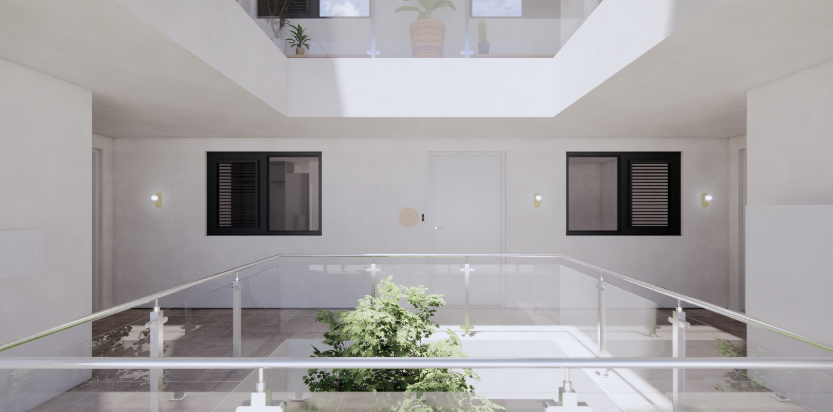 The central lobby leads to three ground floor apartments. On the left and right side, the apartment designs are mirrored. Enter a spacious open floor plan where a modern kitchen flows into the living area, connected to a balcony with garden views. Two roomy bedrooms, two full bathrooms and one guest toilet are connected by a hallway, offering convenience. Converting a bedroom into a home office adds appeal, especially for young professionals. This apartment concept, which is repeated on the first floor, is reached via an elevator or by using stairs.