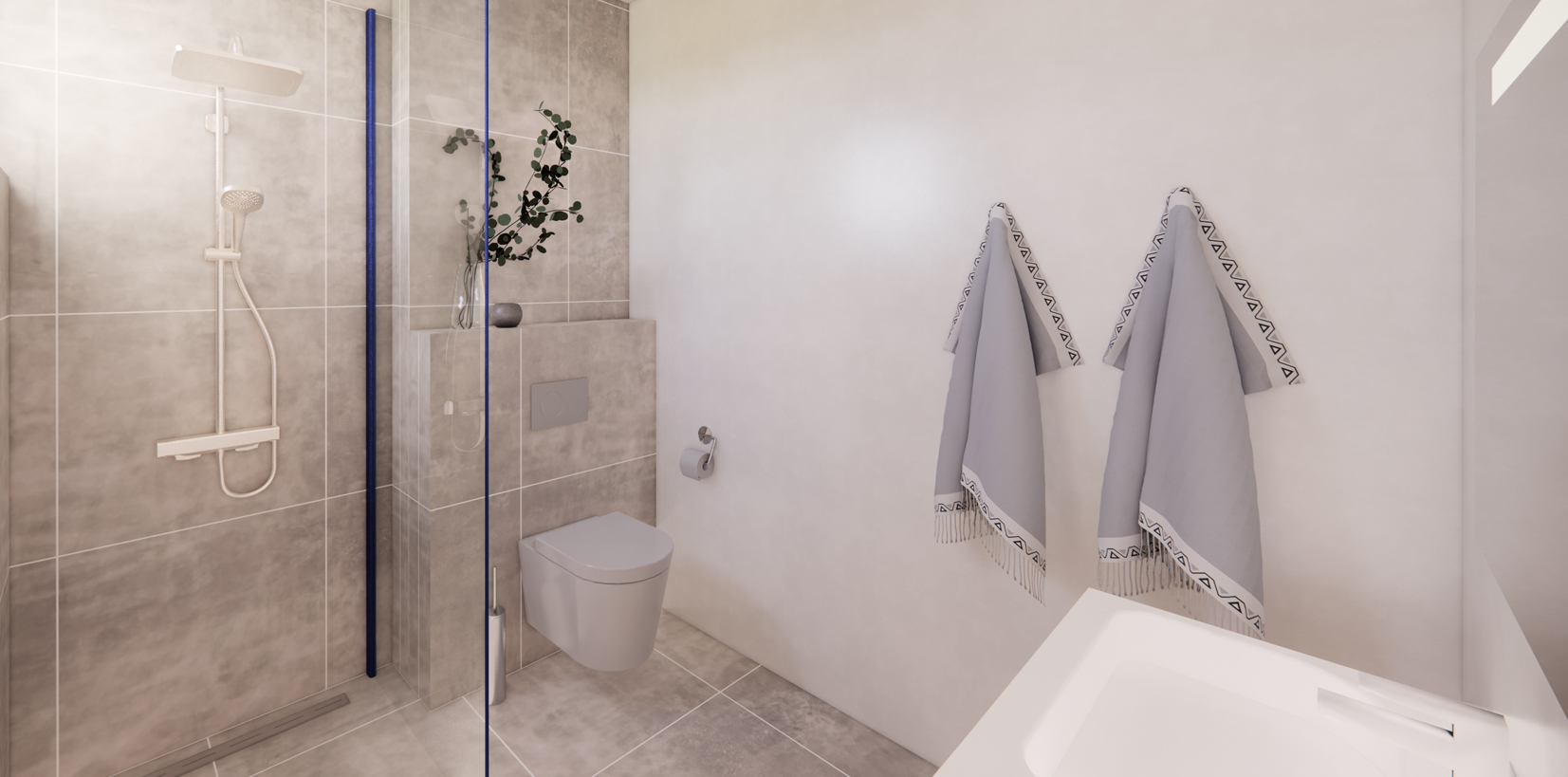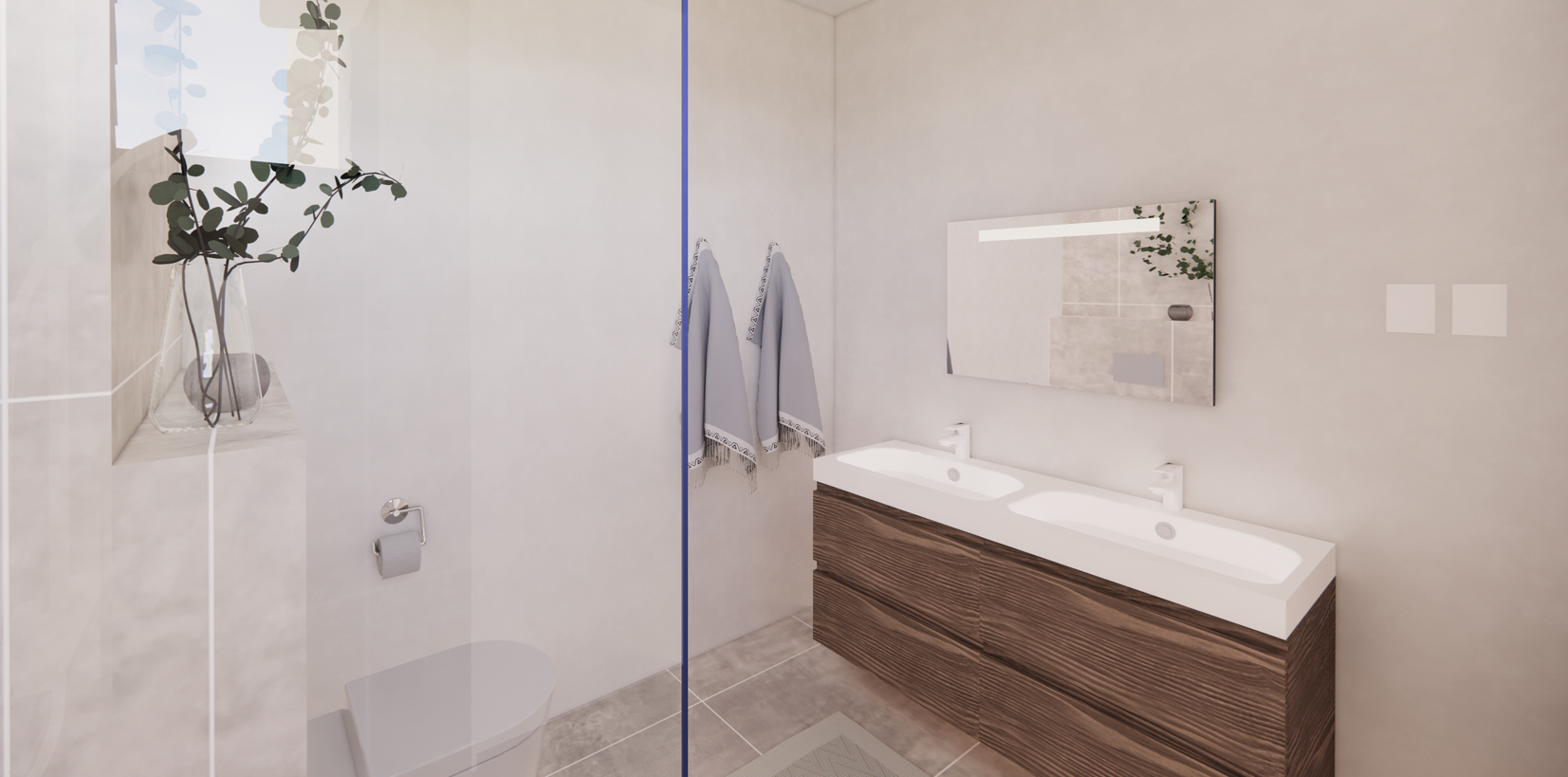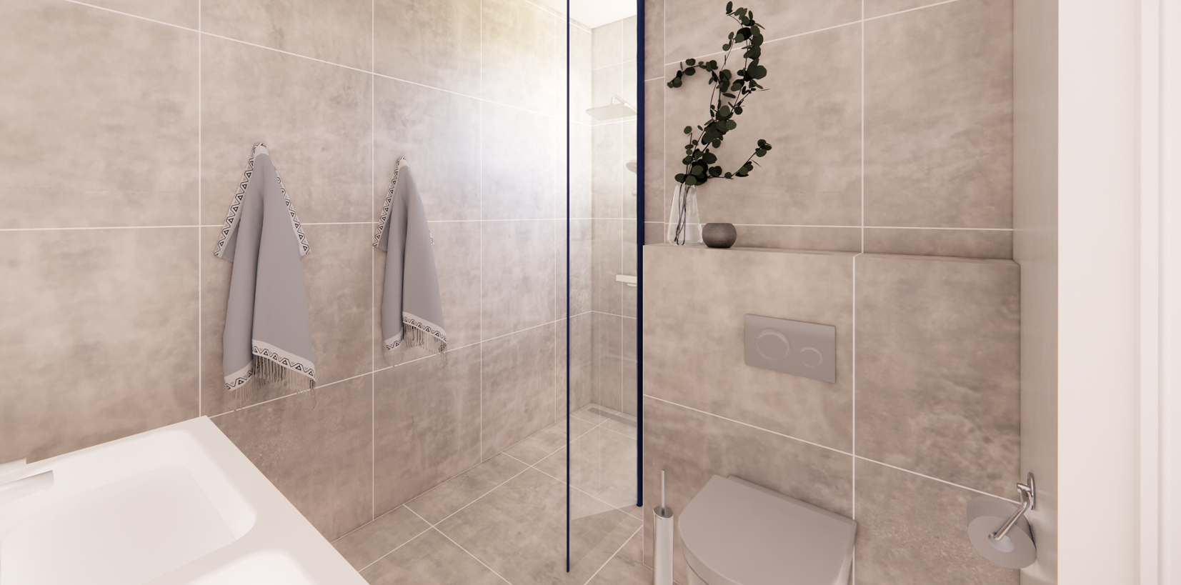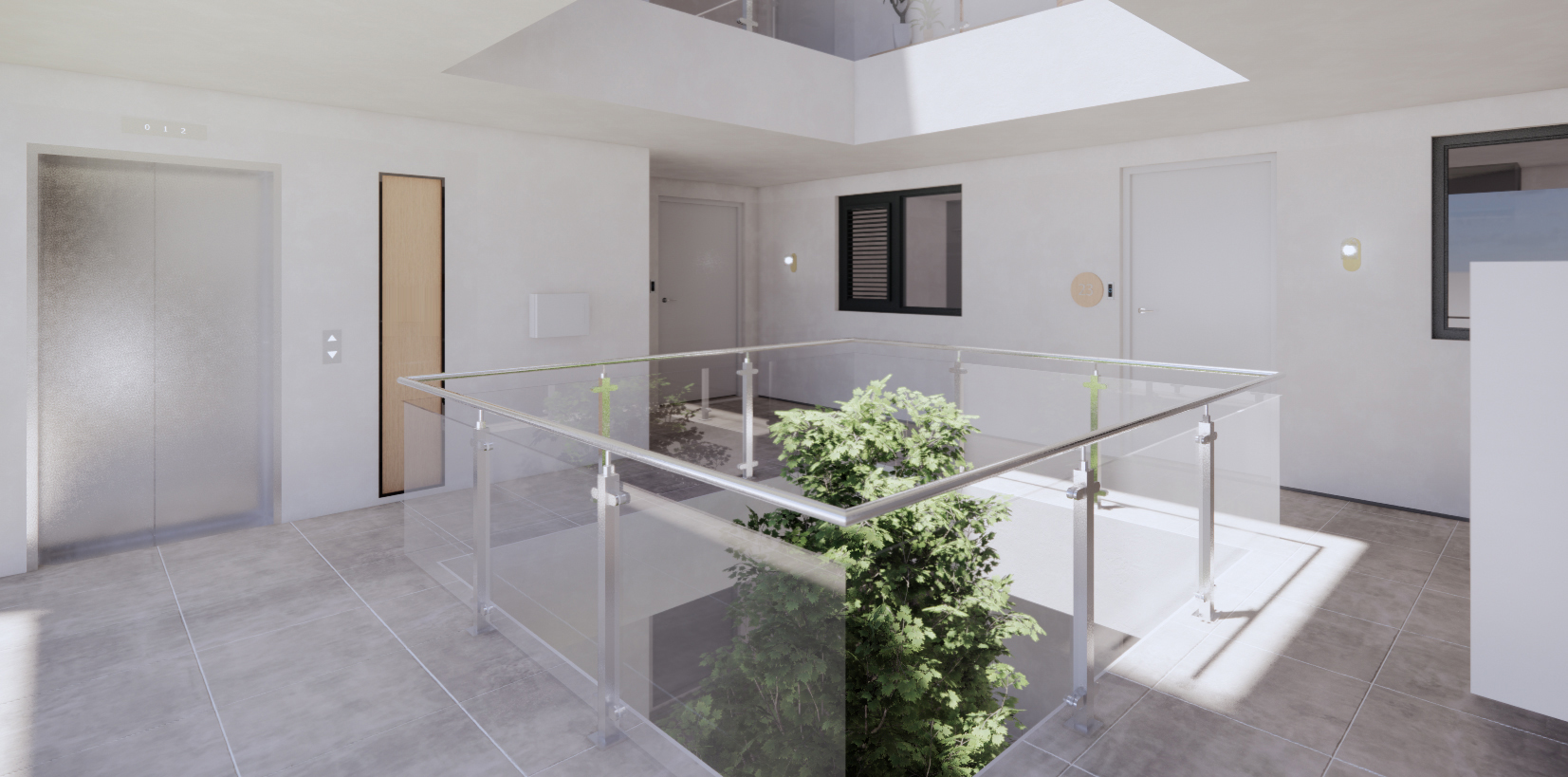 The central lobby leads to three ground floor apartments. On the left and right side, the apartment designs are mirrored. Enter a spacious open floor plan where a modern kitchen flows into the living area, connected to a balcony with garden views. Two roomy bedrooms, two full bathrooms and one guest toilet are connected by a hallway, offering convenience. Converting a bedroom into a home office adds appeal, especially for young professionals. This apartment concept, which is repeated on the first floor, is reached via an elevator or by using stairs.