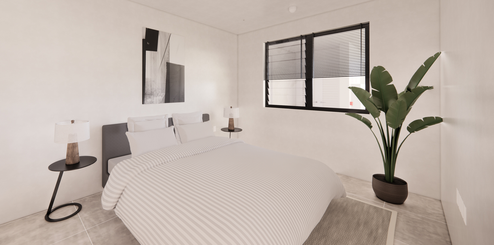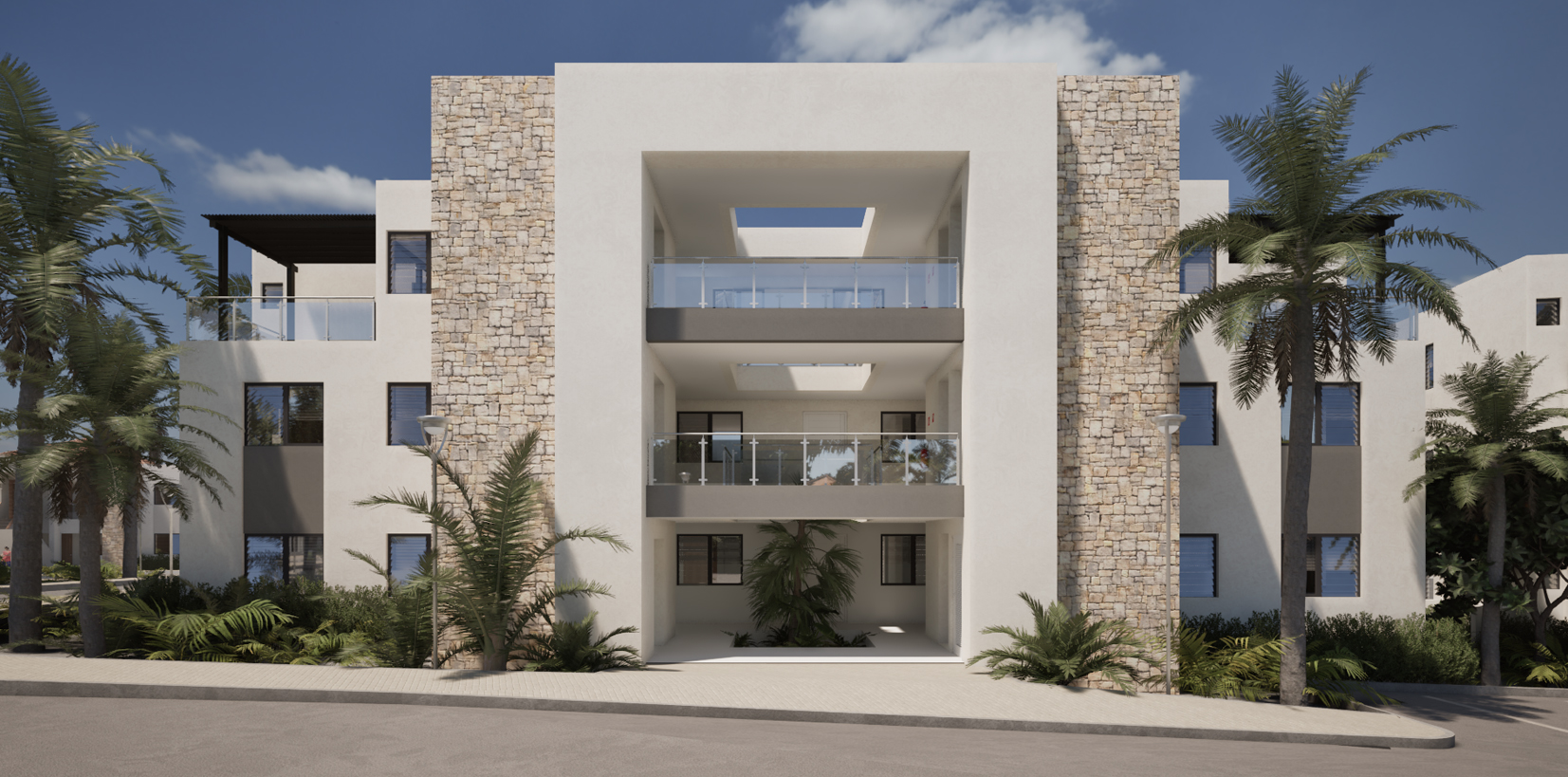 Jutting out from the façade, the central apartments define four of the apartment building's distinct appearance. This airy two-bedroom home features an open floor plan with a captivating kitchen island that extends to a spacious balcony, seamlessly merging indoor and outdoor spaces. Unique in its lofty design, the apartment has two ample bedrooms and two full bathrooms and is an ideal abode for young professionals, empty nesters, or retirees. The loft concept is replicated on the first floor, which is accessible via an elevator or by using stairs.