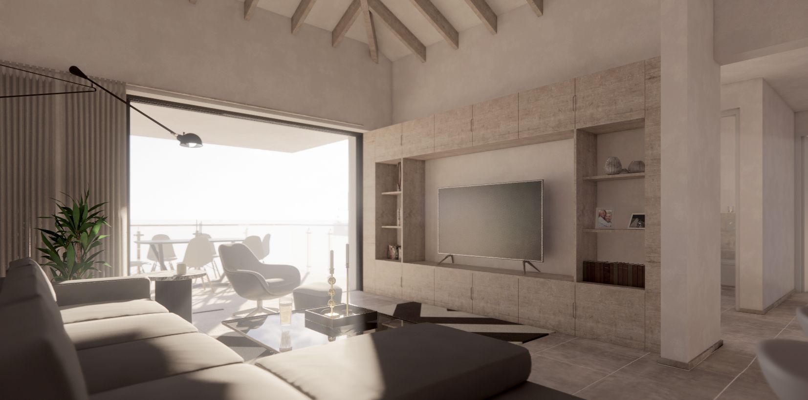 Riding the elevator to the second floor reveals a spacious, airy oasis. The entrance leads to an expansive living room with a modern open kitchen, complete with a sizable cooking island which serves as an ideal area for entertainment and family get-togethers. A roomy balcony extends the living space outdoors, creating a city-living ambiance. Opposite the central living area, you will find two private and comfortable bedrooms. The master bedroom opens onto a romantic terrace beneath the Caribbean stars.
